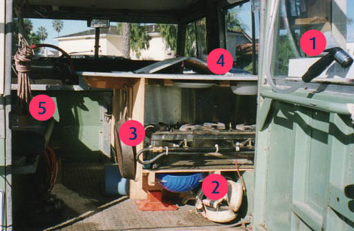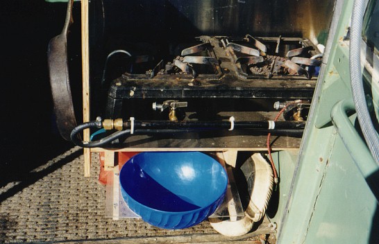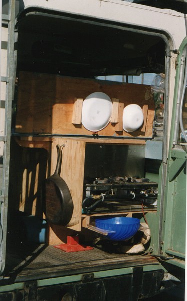 But when it rained, I had a great set up: 1. 15 Gallon water tank rigged to a spigot over the rear door. 2. This "sink" was on a pull-out drawer 3. Two burner propane stove, rigged to 10 lb propane tank on roof. Stainless steel heat shield behind. 4. Continuous sleep surface from rear door to front windscreen. Storage underneath. 5. Side-facing "desk" space.