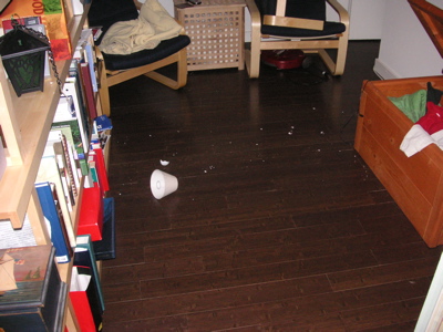 Back in the condo, a lamp fell and did shatter Caught up by the cord and full of shame |