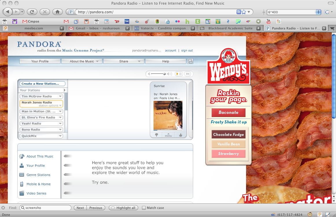 This post is about the fortuitious discovery of bacon where I least expected it — on the online music sharing site Pandora. They have some deal with Wendy’s that tempts users like me with photos of sweet swine.