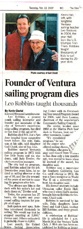 Leo Robbins (blue jacket) taught me to sail. He ran the Parks and Recreation sailing department in Ventura from a shed next to the fuel dock. At the end of the class he had to read the exam to me because I didn’t yet know how to read. (More after the jump)
